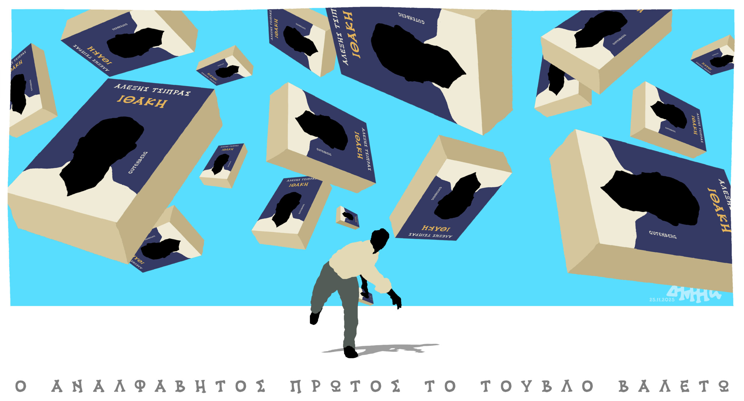 Χωρίς τίτλο (γελοιογραφία δημοσιευμένη στην εφημερίδα «Η Καθημερινή», 25.11.2025) Δημήτρης Χαντζόπουλος Χωρίς τίτλο (γελοιογραφία δημοσιευμένη στην εφημερίδα «Η Καθημερινή», 25.11.2025) 2025 giclee εκτύπωση σε μουσειακό χαρτί, 1/6 28,5 x 44 εκ.